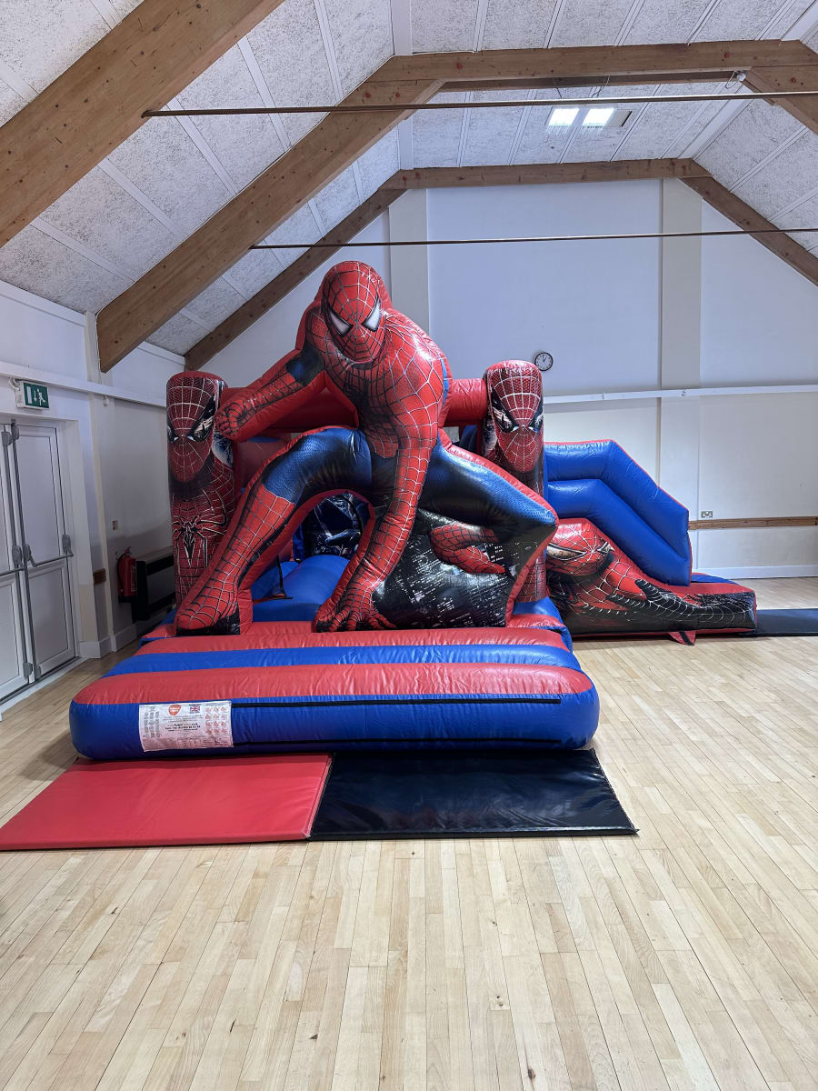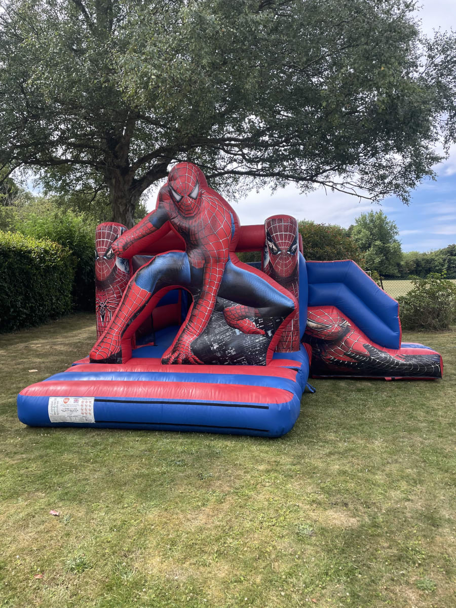Book the 3D Spiderman for high-energy fun. This 3d spider man combi bouncy castle combines a large bounce area with an integrated slide and themed 3D graphics. Perfect for birthdays, family events, nurseries and community fairs.