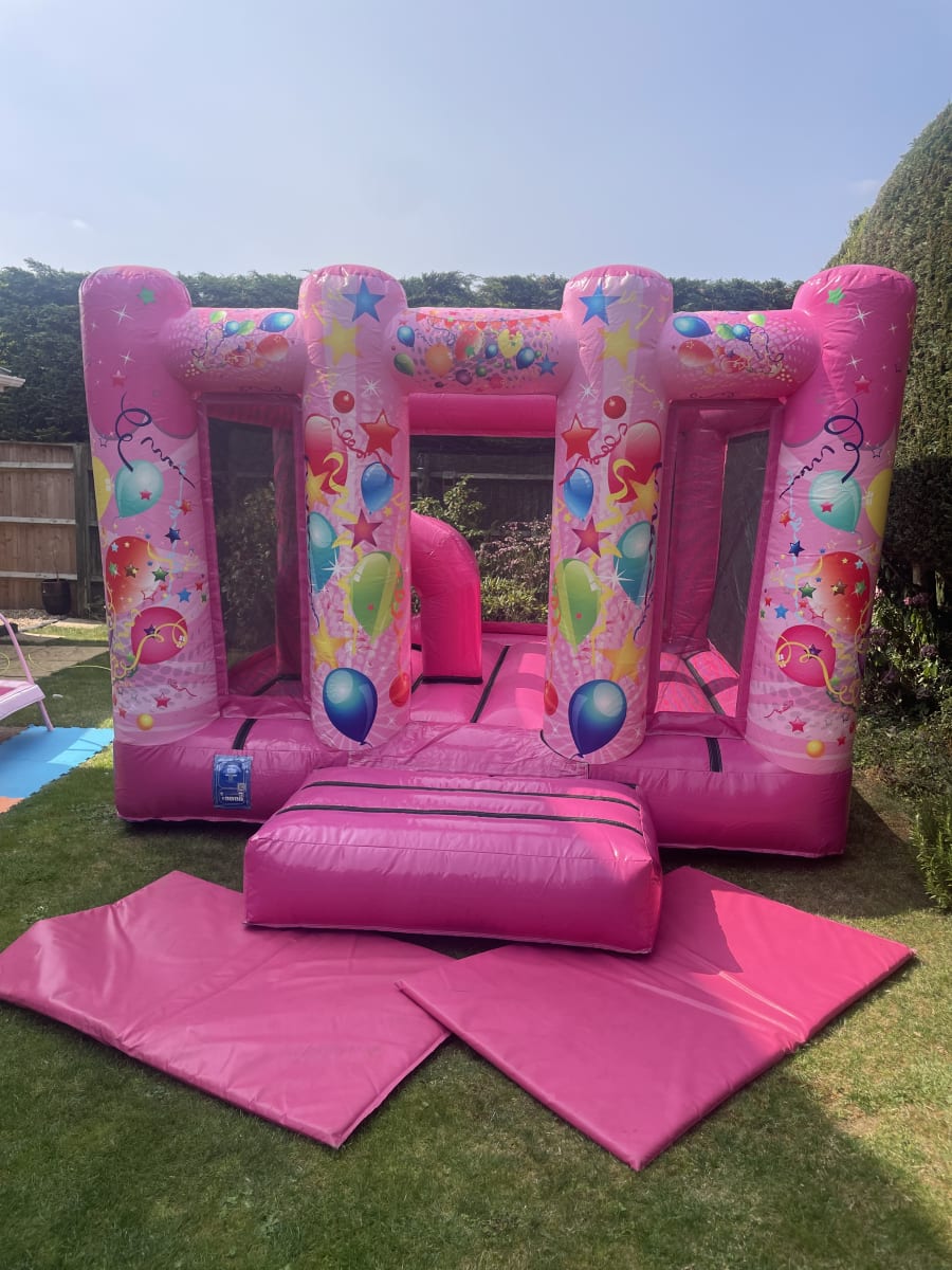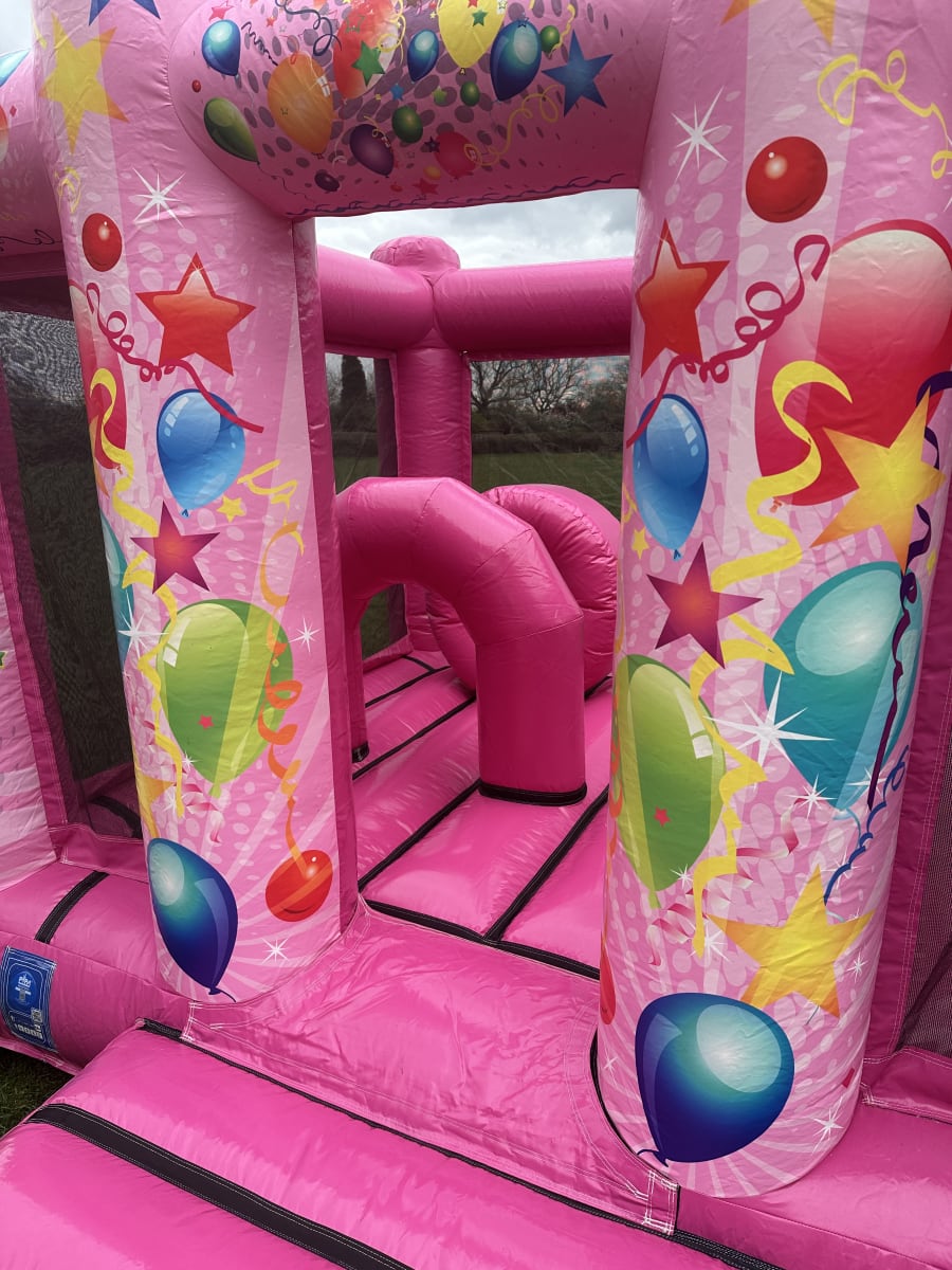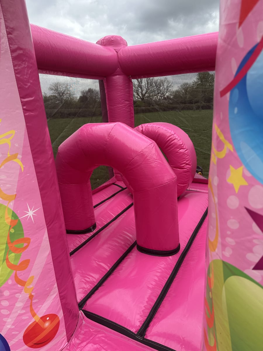 Make your next party memorable with the Pink Party Obstacle Castle. This pink balloon design obstacle bouncy castle delivers color, activity and excitement for children’s parties, family gatherings and community events. Choose bouncy castle rental Pink Party Obstacle Castle in Amersham, Buckinghamshire and surrounding areas for a show-stopping feature that combines safe play with non-stop fun.